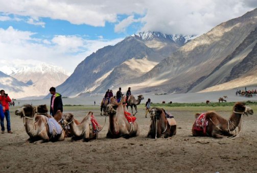 Safari en camello bactriano en las dunas de arena de Hunder: el valle de Nubra es famoso por el safari en camello bactriano. Estos camellos son conocidos por sus dos jorobas, en lugar de los camellos de una joroba que se ven habitualmente. Eran el principal medio de transporte para viajar por la Ruta de la Seda. Ahora se utilizan para los safaris en la región y son extremadamente populares entre los turistas.